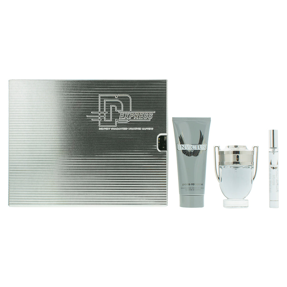 Paco Rabanne Invictus Eau De Toilette 3 Piece Gift Set: Eau De Toilette 50ml - Eau De Toilette 10ml - Shower Gel 100ml•Paco Rabanne design house launched Invictus in 2013 as a citrus aromatic fragrance for men.• Invictus is a s...