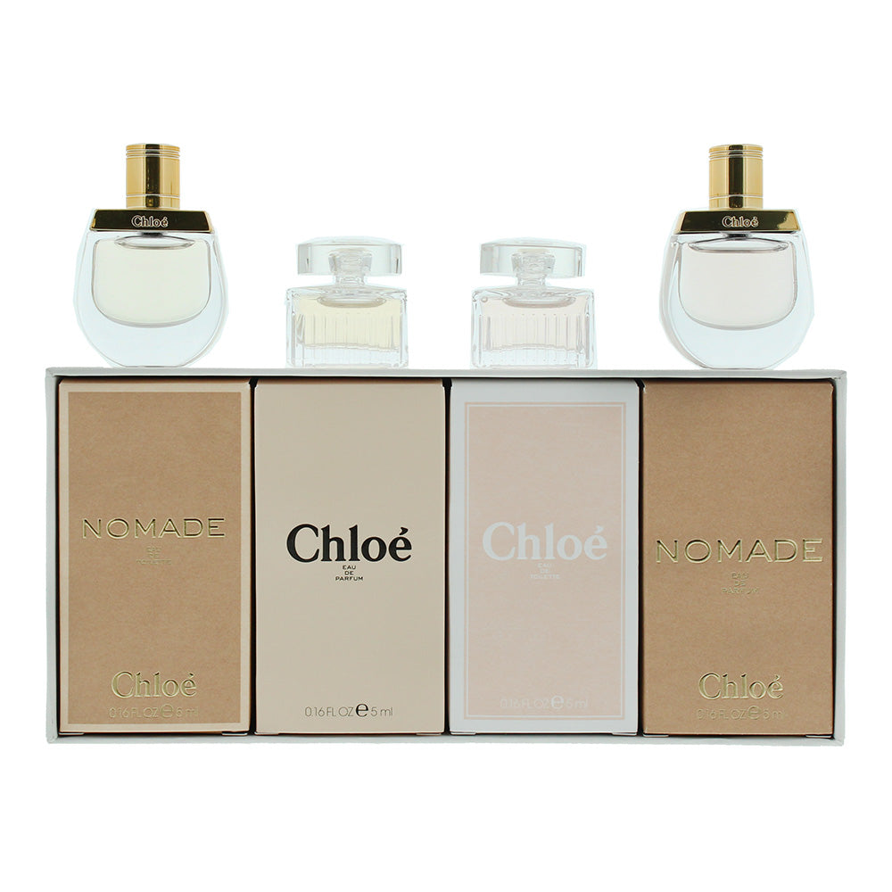 Chloe 4 Pcs Mini Set: Nomade EDP 5ml + Signature EDP 5ml + Signature EDT 5ml + Nomade EDT 5ml•Nomade by Chloe is a chypre floral fragrance for women.• Top notes: Mirabelle, bergamot, lemon and orange.• Middle notes: freesia, ja...